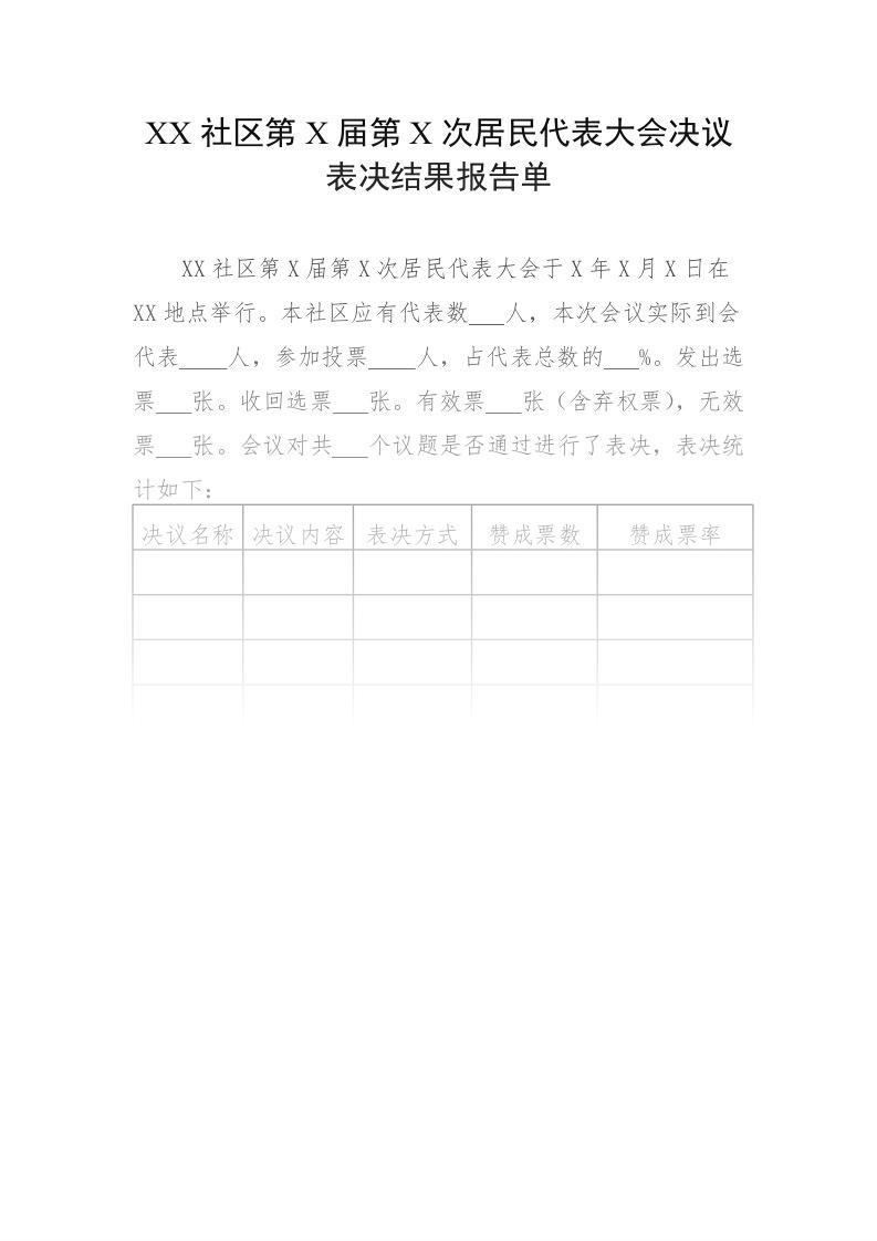 社区第X届第X次居民代表大会决议表决结果报告单